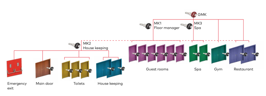 Liste bu şekilde çoğaltılabilir. Burada amaç, minimum anahtar sayısıyla oteli yönetmektir. Her kapının ayrı bir anahtarı olmasından kaçınılmalıdır. Personelin kendisiyle ilgili kapıların tamamını tek bir anahtarla açması sağlanmalıdır.
